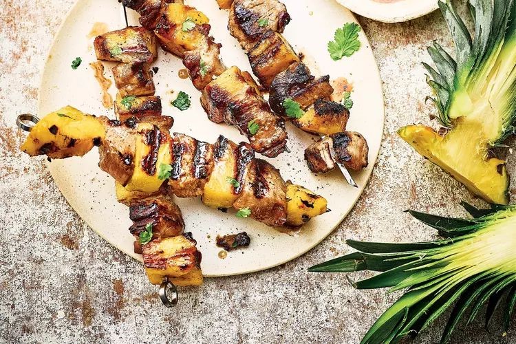 - Coupez la viande et l’ananas en cubes. Alternez-les sur des piques et déposez-les dans un plat creux.