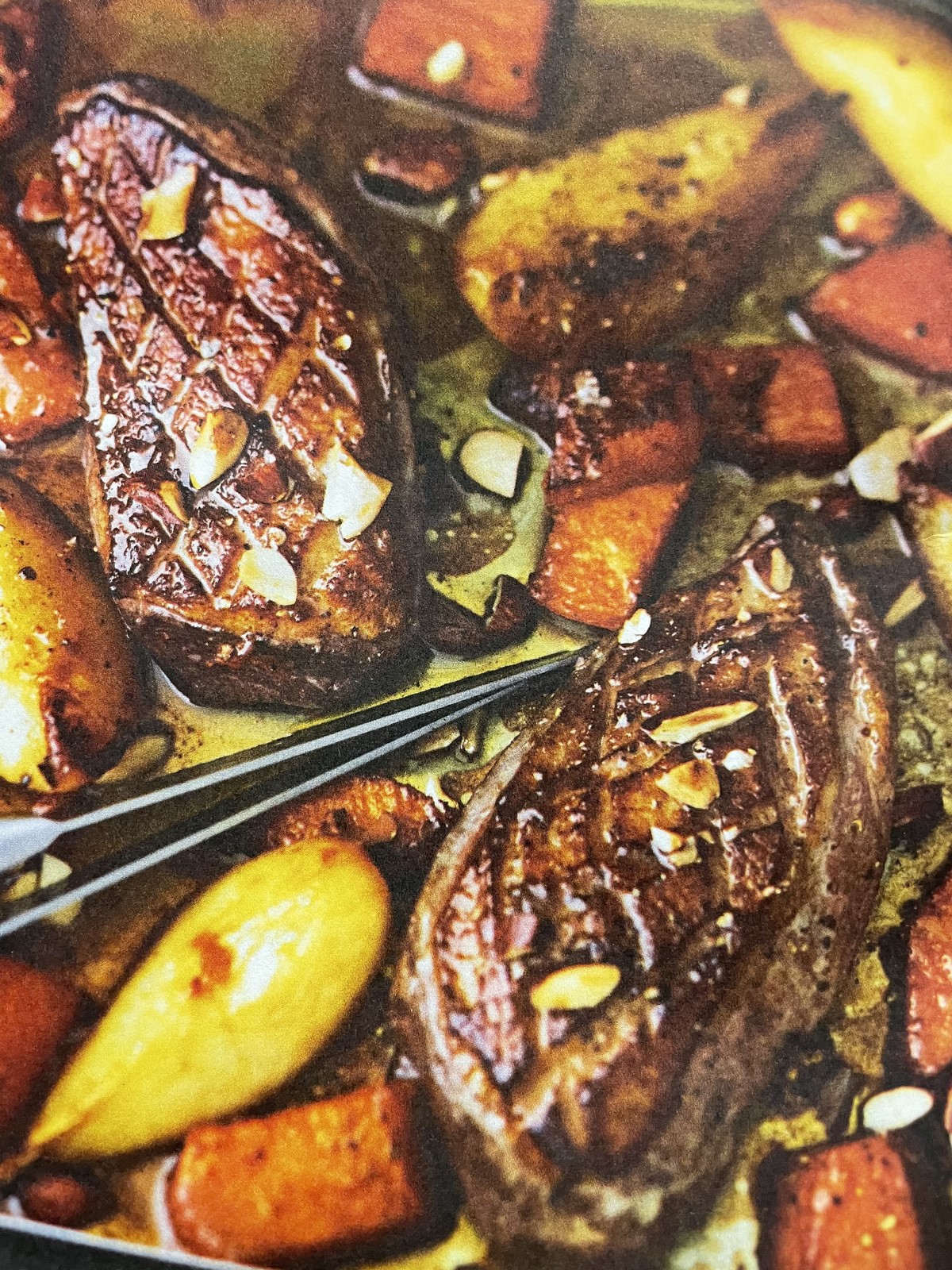 - Salez, poivrez, parsemez d'amandes grossièrement concassées et enfournez pour 8 à 10 mn (prolongez la cuisson de 4 5 mn pour des magrets bien cuits)