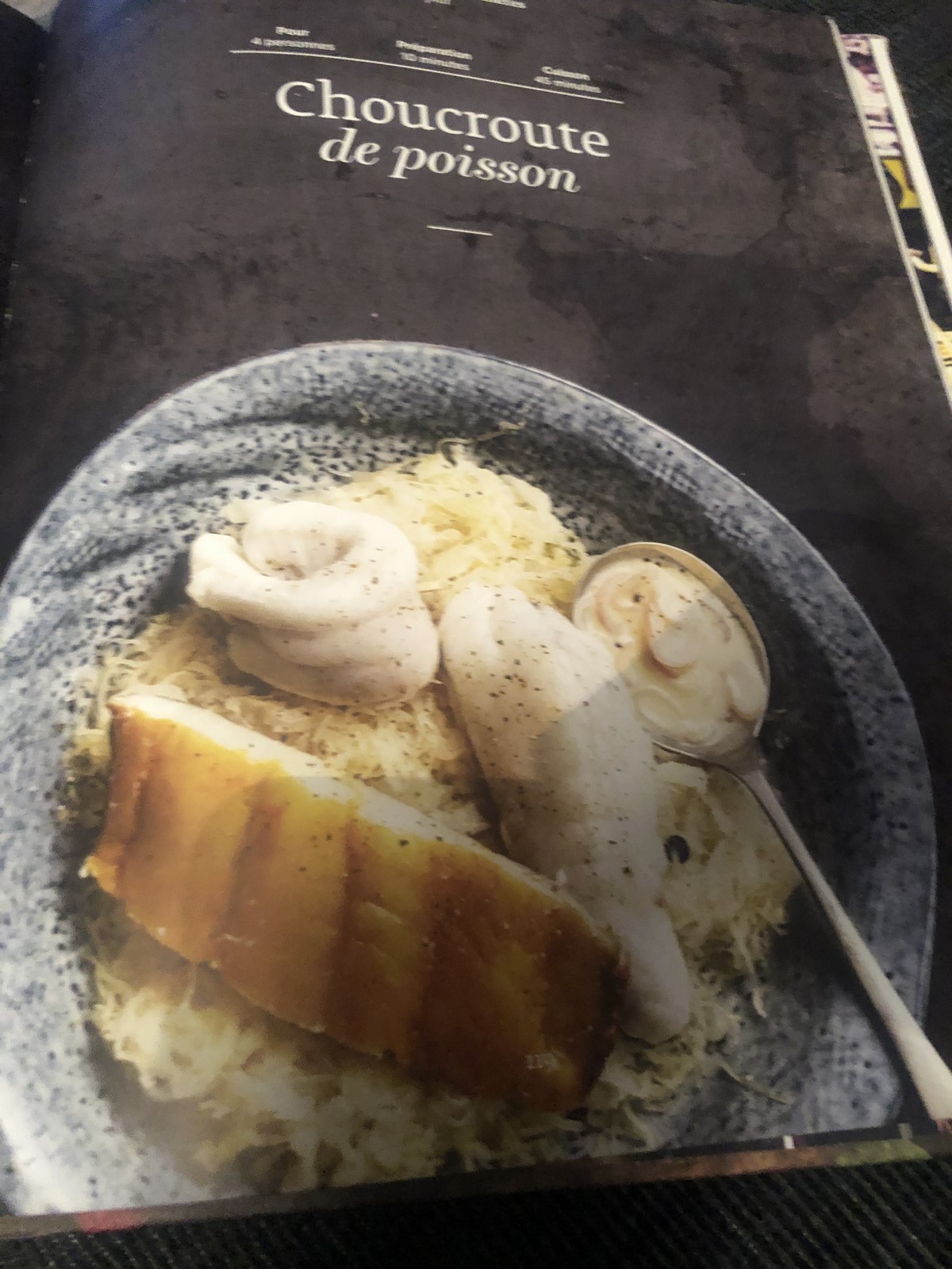 - Dans un plat allant au four, étalez la moitié de la choucroute, posez dessus les poissons et recouvrez d'une couche de choucroute. Arrosez d'un verre de vin blanc sec, enfournez et laissez cuire 45 mn. Mettre un paier sulfurisé sur le plat.