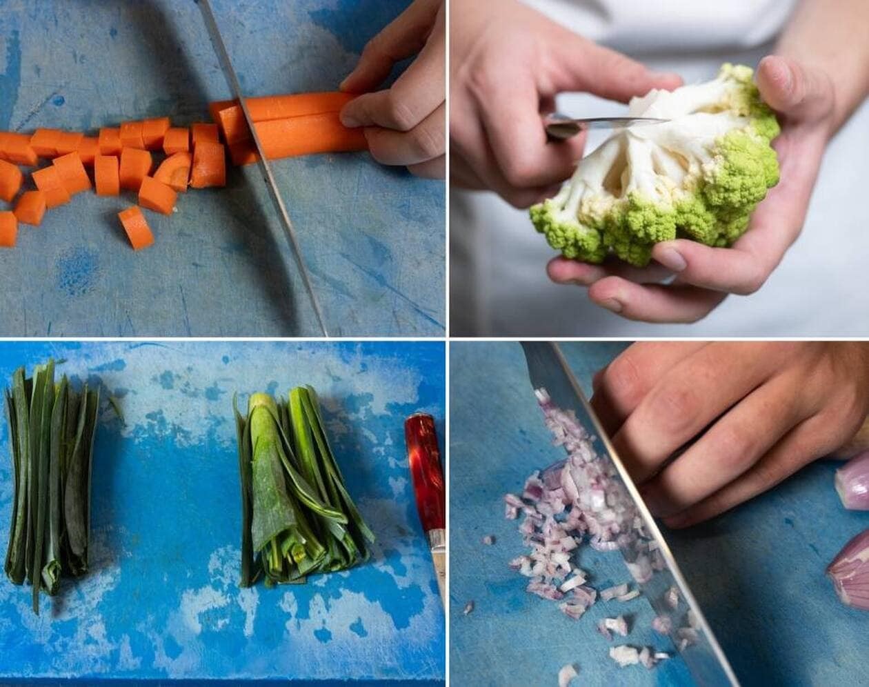- Cuire les carottes dans une partie du fumet. Une fois qu’elles sont cuites, réaliser une purée avec 20 g de beurre et 50 ml de lait. Cuire 10 minutes les pommes de terre dans le fumet, puis les sauter au beurre. Cuire les blancs de poireaux dans le fumet.