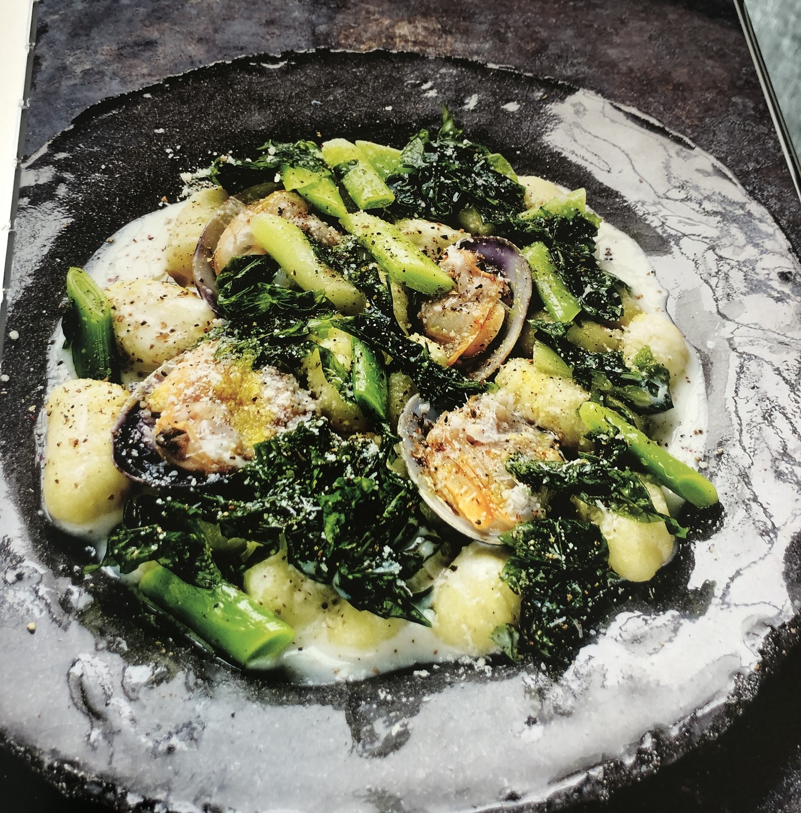 - Une fois les palourdes ouvertes, ajouter la crème liquide, la laitue de mer, les poireaux, les gnocchis et finir de cuire rapidemment à découvert pour obtenir une jolie liaison.