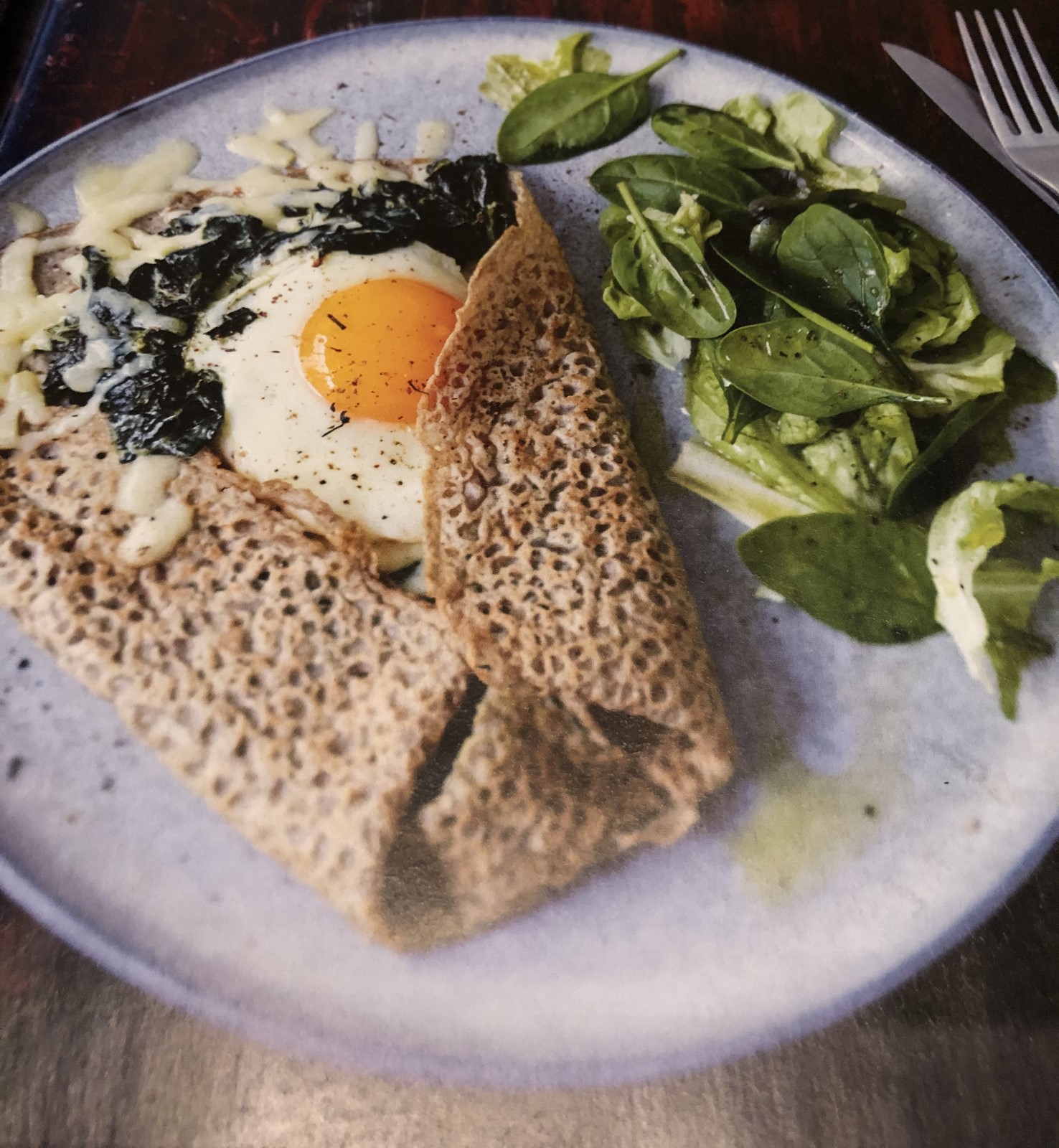 Crèpe de sarasin à la fondue d'épinards, oeufs et gruyère