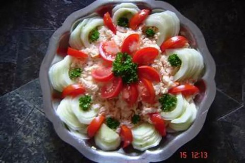 - Pour finir Mettre cette préparation dans un plat de service et décorer le plat avec des tomates, du concombre et du persil.