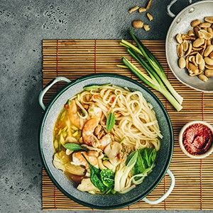 - Répartissez les nouilles, les shiitakes et les crevettes dans 4 bols. Arrosez de bouillon et de jus de citron. Décorez de ciboule et de cacahuètes, puis rectifiez l’assaisonnement si besoin. Servez aussitôt.