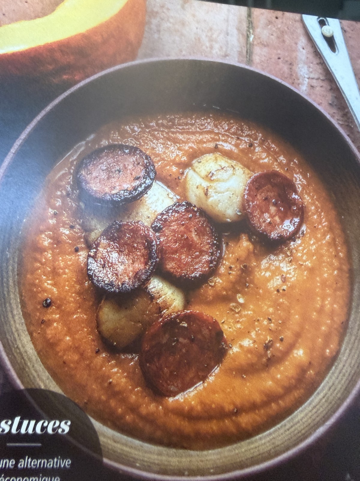 - Transvasez la soupe dans 6 bols et agrémentez de rondelles de chorizo, de saint jacques.