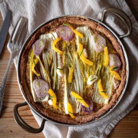 Tarte à l’oignon, moutarde à l’ancienne, endives et orange