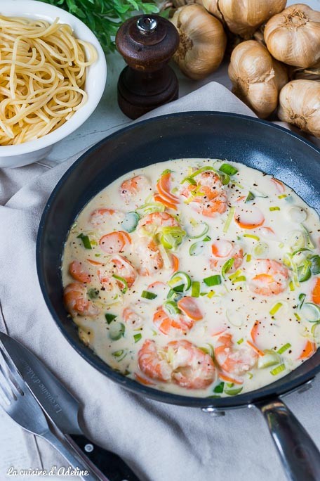J’ai utilisé des crevettes roses pour cette recette (déjà cuites donc). Vous pouvez également réaliser cette recette avec des gambas ou, comme on me l’a demandé en commentaire sur Facebook : avec des noix de St. Jacques. Si vous optez pour les noix de St. Jacques, faites les revenir de chaque côté très rapidement et ajoutez-les en toute fin de cuisson dans la sauce. Ça évitera qu’elles soient trop cuites (et caoutchouteuses).
