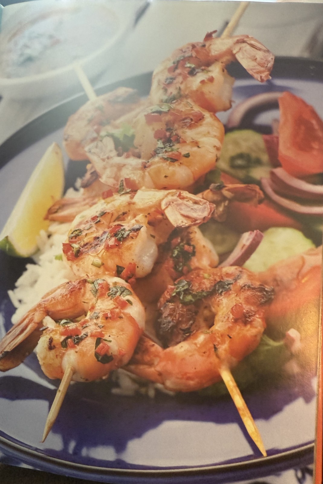 - Décortiquez les gambas en prenant soin soin de ne pas ôter la tête. Réaliser les brochettes en alternant gambas et tomates cerises, assaisonner.