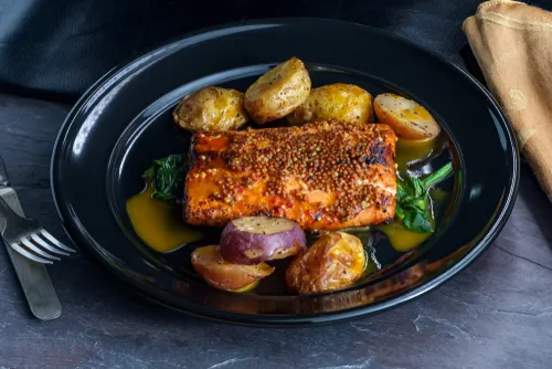 - Saumon rôti au cidre, purée de céleri au citron vert