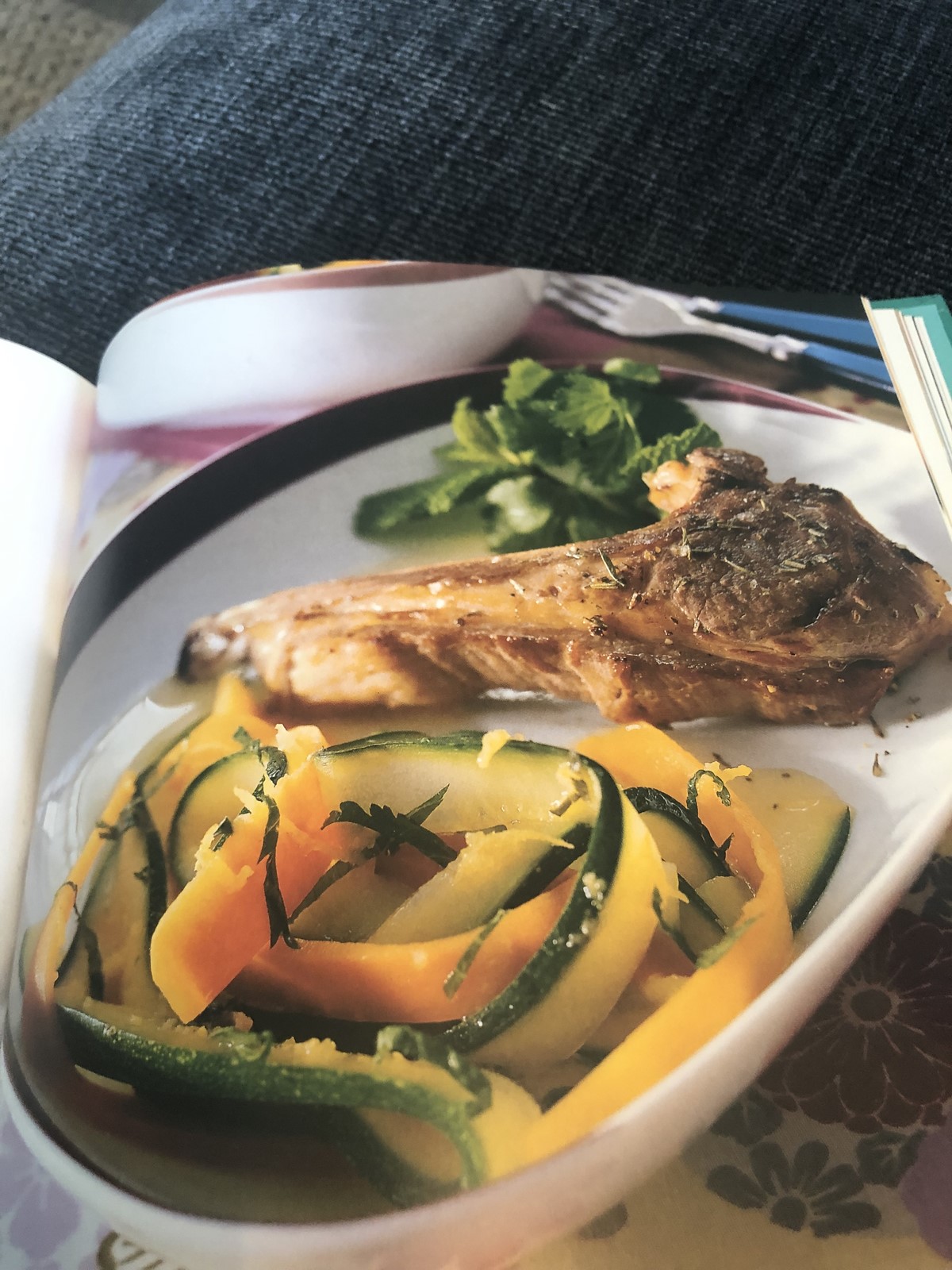 - Déposer les courgettes et la côte d'agneau sur une assiette.