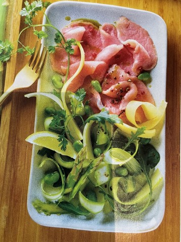- Répartissez les tranches de filet de veau sur les assiettes. Disposez les lamelles d'asperges et les fèves harmonieusement sur les tranches de veau. Assaisonnez d'un filet d'huile d'olive, de zeste de citron, de fleur de sel et de baies roses. Terminez par les lamelles de beaufort. Servir très frais.