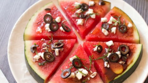 - Fouettez ensemble l'huile d'olive et le vinaigre balsamique réduit. Nappe-en les pastèques, salez, poivrez et servez.
