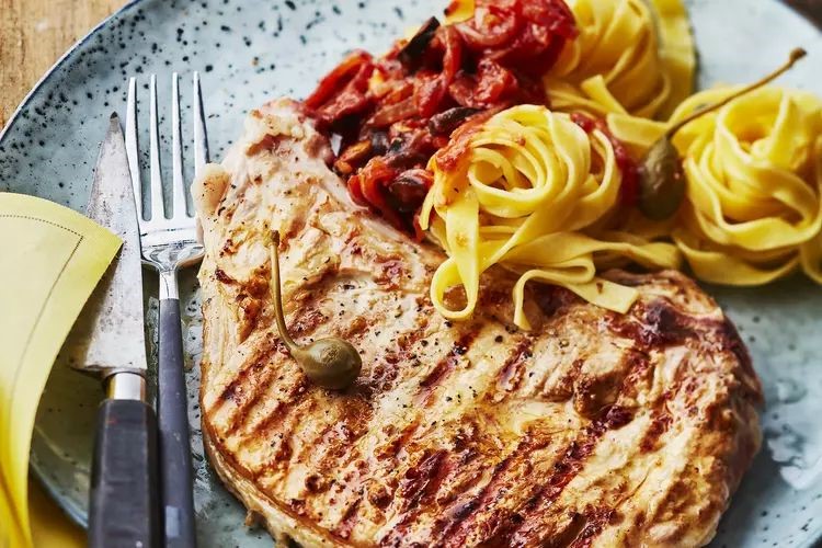 Grillades de veau et pâtes à la puttanesca