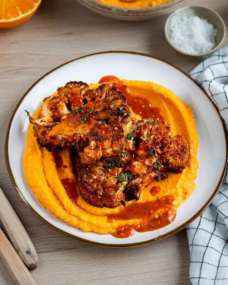 - Détaillez le chou-fleur en steaks : tranchez au centre du tronc, puis découpez un steak de chaque côté. Réservez le reste du chou-fleur pour une autre préparation.