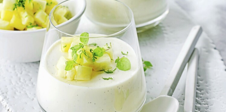 - Coupez l’ananas en petits dés et arrosez de jus de citron vert. Disposez-les sur les panna cottas et placez au frais jusqu’au moment de servir