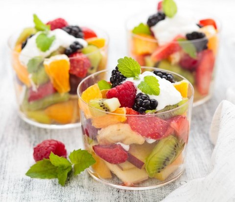 - Placez les fruits dans des verrines et ajoutez 1 à 2 c. à soupe de yaourt sur le dessus.