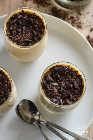 - Recouvrez avec la moitié de la crème au moka, saupoudrez de 4 c à s de copeaux de chocolat ( ou 1 c à s pour les verrines), puis déposez une deuxième couche de biscuits imbibés de Baileys par-dessus. Nappez avec le restant de la crème, égalisez la surface et couvrez de cellophane.