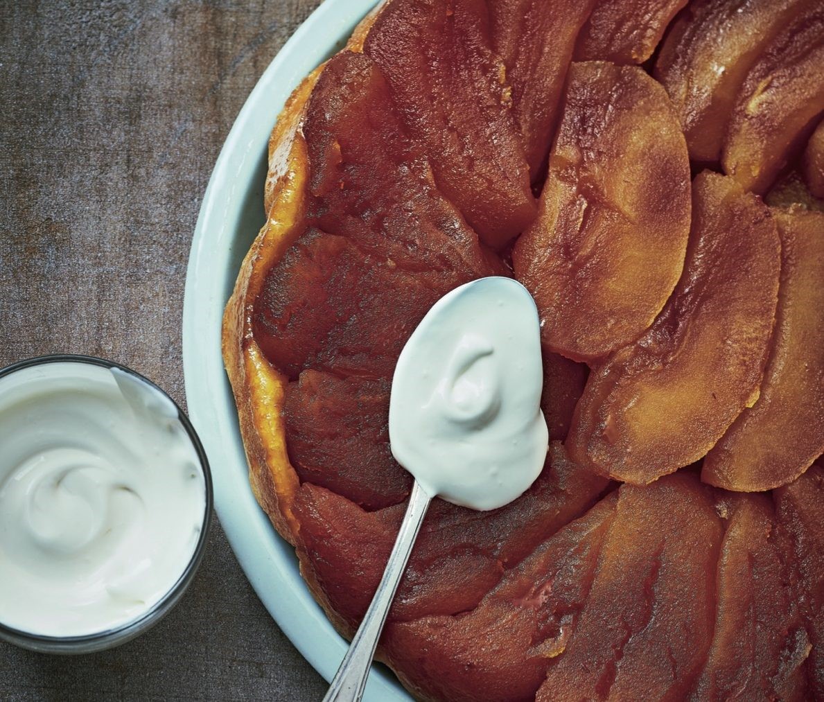 - Laissez tiédir avant de renverser la tarte dans un plat. Dégustez encore chaud avec une cuillerée à soupe de crème fraîche épaisse fermière.