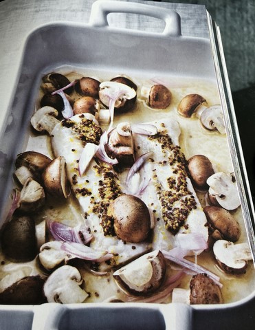 - Salez et poivrez les filets de poisson, les enduire de moutarde sur le dessus. Les étaler sur la garniture aux champignons. Enfournez 15 mn, remuer et arroser avec un peu d'eau à mi-cuisson.