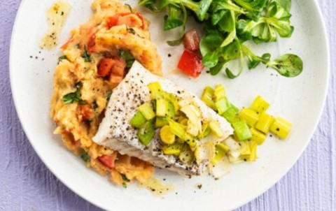 - Servez vos pavés de poisson en les accompagnant de purée à la tomate, de poireaux et de mâche. Salez et poivrez.