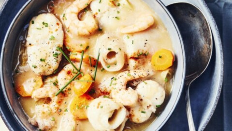 - Déposez les filets de sole et les crevettes dans le faitout, pochez-les 3 minutes, et servez-les immédiatement.