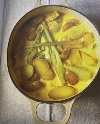 - Mettre le bouillon de légumes dans une cocotte à feu doux, ajouter le safran, les oignons et les fenouils. Laisser cuire pendant 20 mn à feu doux.