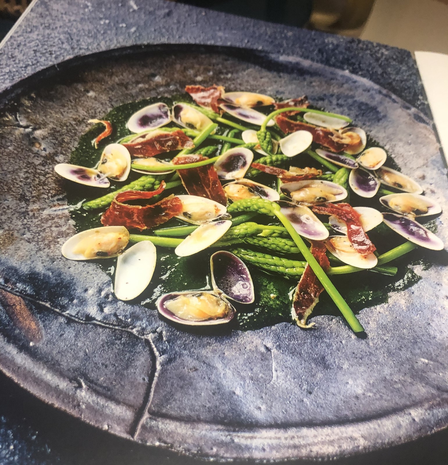 - Servir immédiatement les tellines avec les petits morceaux de jambon cru et les asperges épis. Accompagner du pistou de persil plat.