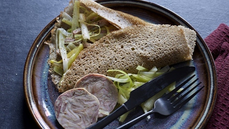 - Cuire les galettes, les beurrer, les fourrer avec les poireaux et les plier en rectangle.