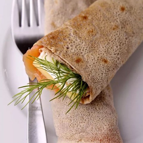 - Sur chaque crêpe mettez un peu de haddock et de crème fouettée avec un brin d'aneth, repliez.