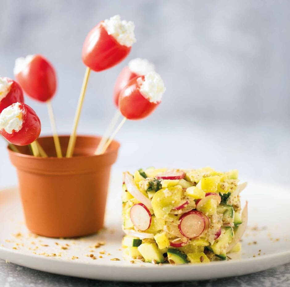 5. Couper le chapeau des tomates cerise et les vider. Les remplir avec du fromage de chèvre frais. Les piquer et les disposer dans un pot en céramique ou à plat à la manière d’un bouquet.
