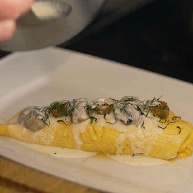 - Pour le dressage, déposez sur le dessus de l’omelette les huîtres pochées entières, en alternance avec des croutons de pain cuits à l’huile d’olive ou au beurre comme Dumas, versez la sauce sur le tout, ajoutez quelques brins de persil et poivrez.