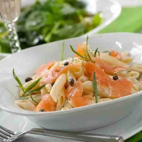 - Joignez-y les pâtes, le saumon fumé ainsi que les dés de concombre et de pommes.