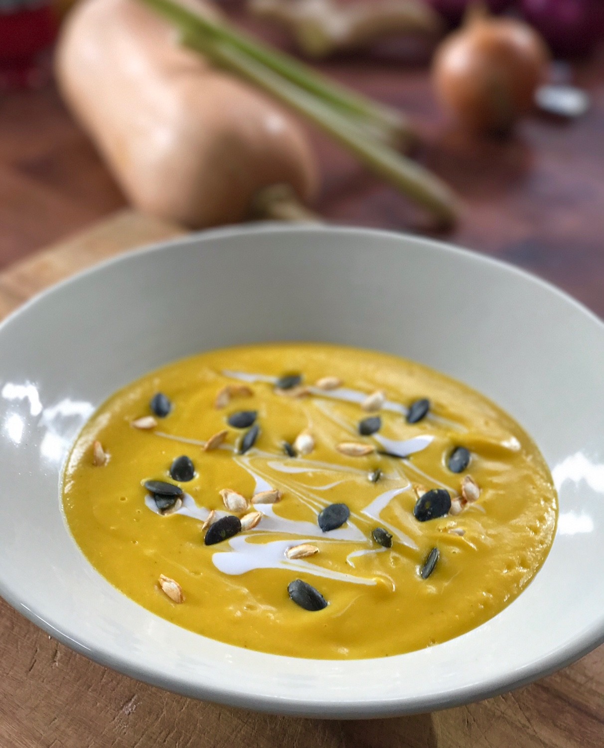 - Avant de servir la crème de courge, ajoutez le reste du lait de coco sans remuer, saupoudrez de graines de courges.