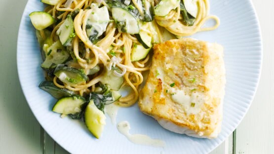 - Répartissez vos spaghettis aux courgettes dans 4 assiettes et accompagnez-les de vos pavés de lieu jaune.