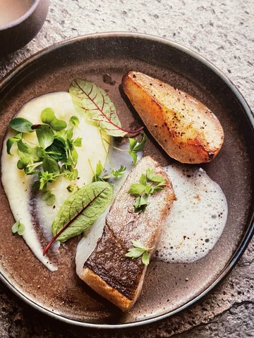 - Dresser les assiettes en commençant par la purée de panais, le morceau de poire, le pavé de lieu et terminer en déposant l'écume de curry et en décorant de jeunes pousses.