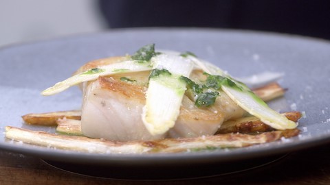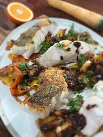 Lieu jaune doré, barigoule de fenouils aux citrons confits