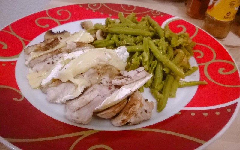 - Coupez le brie en lamelles et intercalez les lamelles de brie et de champignons aux lamelles de poulet.