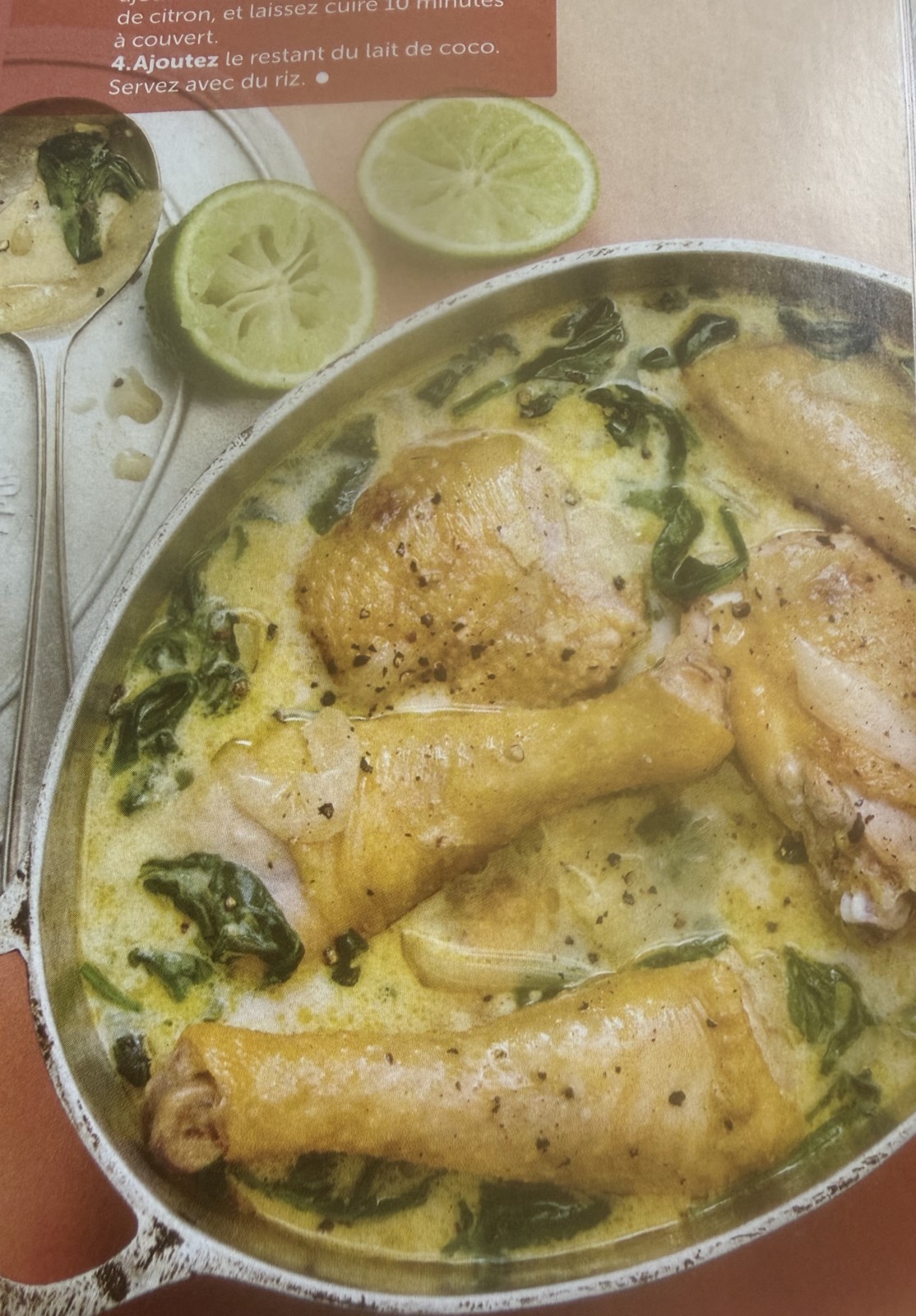 - Ajoutez les épinards. Mélangez et laissez cuire 15 mn. Terminez en ajoutant 2/3 du lait de coco et le jus de citron et laissez cuire 10 mn à couvert.