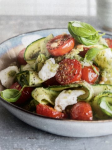 Salade de tomates cerises, courgettes, pesto et mozzarella