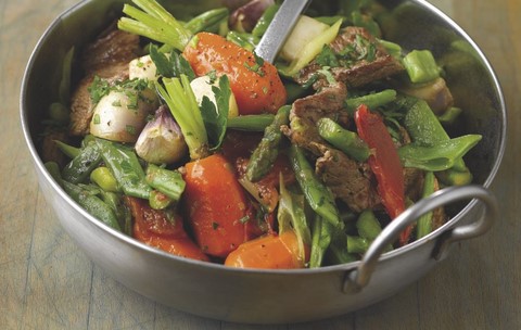 - Ajoutez ensuite les cocos plats, les asperges, les cébettes et faites sauter 5 mn.