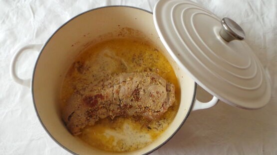 - Ensuite, ajoutez la moutarde ancienne sur le filet mignon en le retournant pour bien l'enrober.Versez un peu d'eau dans la cocotte (1/3 de la hauteur du filet mignon), ajoutez le fond de veau, salez et poivrez.