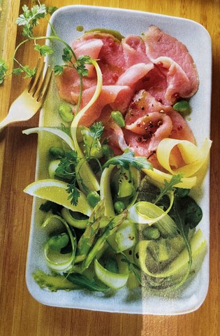 - Répartissez les tranches de filet de veau sur les assiettes. Disposez les lamelles d'asperges et les fèves harmonieusement sur les tranches de veau. Assaisonnez d'un filet d'huile d'olive, de zeste de citron, de fleur de sel et de baies roses. Terminez par les lamelles de beaufort. Servir très frais.